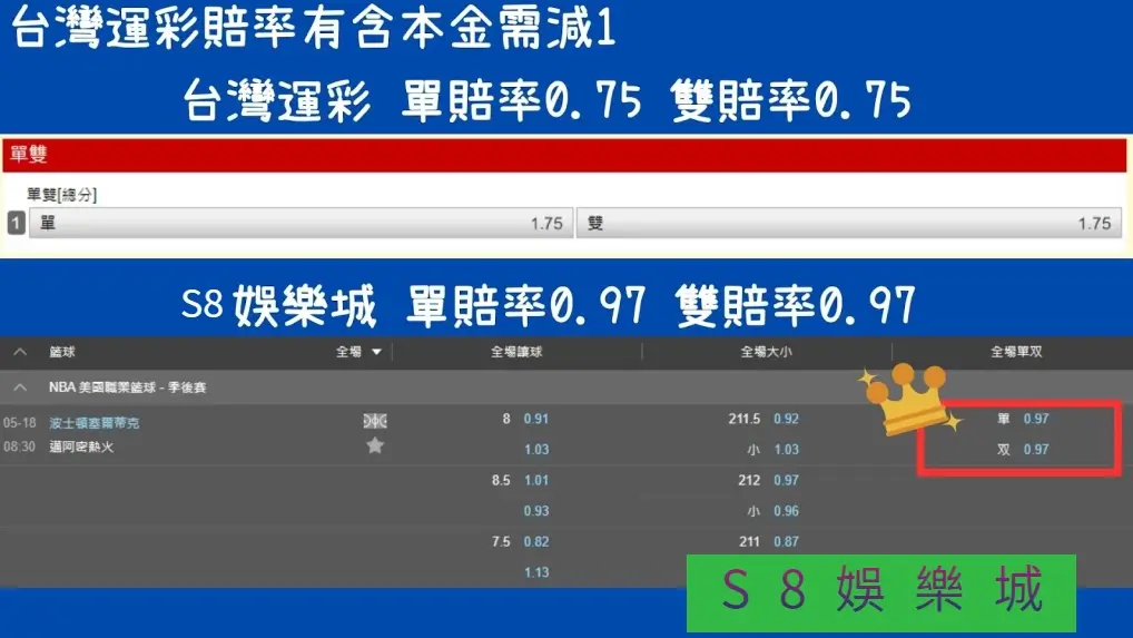 正如我上面所說的,運彩美金盤有它的缺點,而運彩國際盤也有很多套路,一不小心就會遇到詐騙,究竟要去哪裡線上買美國運彩?推薦您到S8娛樂城下注,S8娛樂城是屬於1.97水位的運彩國際盤,場均賠率都在0.98以上,不只賠率高於台灣運彩,更高於其他運彩國際盤網站,玩法更是應有盡有,下注輕輕鬆鬆就可以獲利!