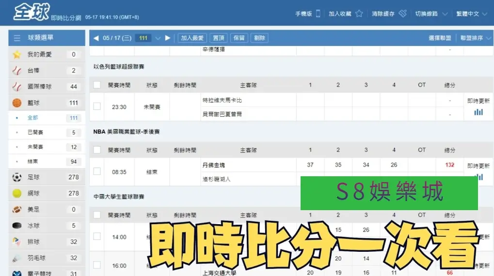 不只有免費體育直播,您還可以在S8娛樂城看賽事即時比分,一手掌握賽況,投注獲利更輕鬆!