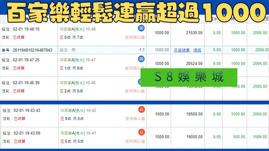 要如何博弈每天贏一點?正如我上面說的,選對平台先贏一半,百家樂更是如此,許多平台看準百家樂玩家多、下注金額大,都會設定25倍以上的碼量,等於您打1000贏970(含水),要打到1000X25=25000才可以出款,但是S8娛樂城不用,所有遊戲都只要1倍本金即可出款,等於是贏錢就可以立即提款了!且每筆提款都會在5分鐘內到帳,選對平台真的先贏一半!