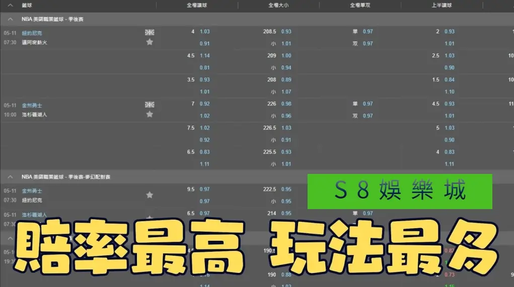 博弈長贏秘訣是什麼?正如上面博弈每天贏一點:百家樂篇提到的,選對平台很重要,S8娛樂城屬於1.97水位的亞盤,場均賠率都在0.98以上,不只賠率高於台灣運彩,更高於其他線上投注平台,玩法更是應有盡有,最重要的是,您可以一邊看免費體育直播一邊場中投注!讓您靠運彩獲利的機率大幅增加!