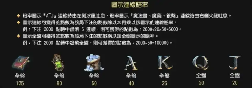 圖示「A~J」連線時由左側冰龍吐息,而圖示「魔法書、魔藥、銀幣」連線時由右側火龍吐息。魔龍傳奇一般連線可獲得的點數為投注金額除以20再乘以該圖示的賠率,而全盤可獲得的點數為投注金額乘以全盤圖示的賠率。