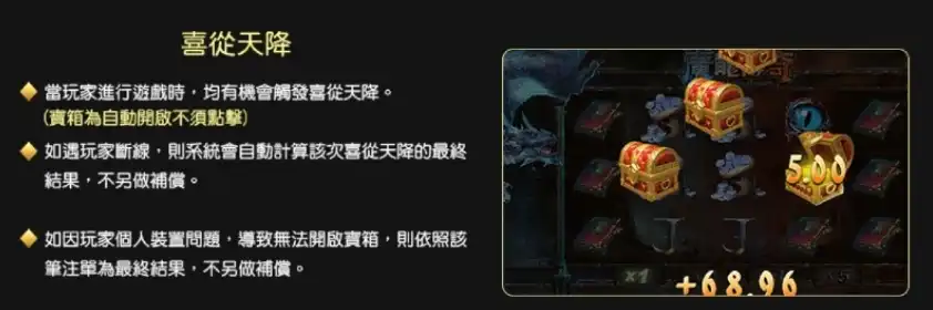 當在魔龍傳奇進行遊戲時,會隨機觸發喜從天降寶箱,寶箱會自動開啟不需點擊,裡面出現的獎金都是白白送給玩家的唷!