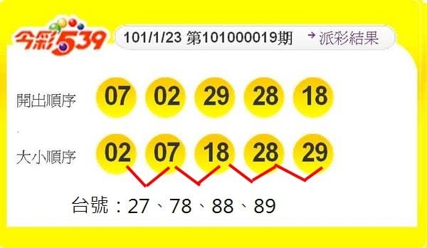 開獎號碼會先由小排到大,2個數字為一組取個位數後合併,共4個即為台號,上圖是今彩539的開獎結果,下面會再進行簡易說明。